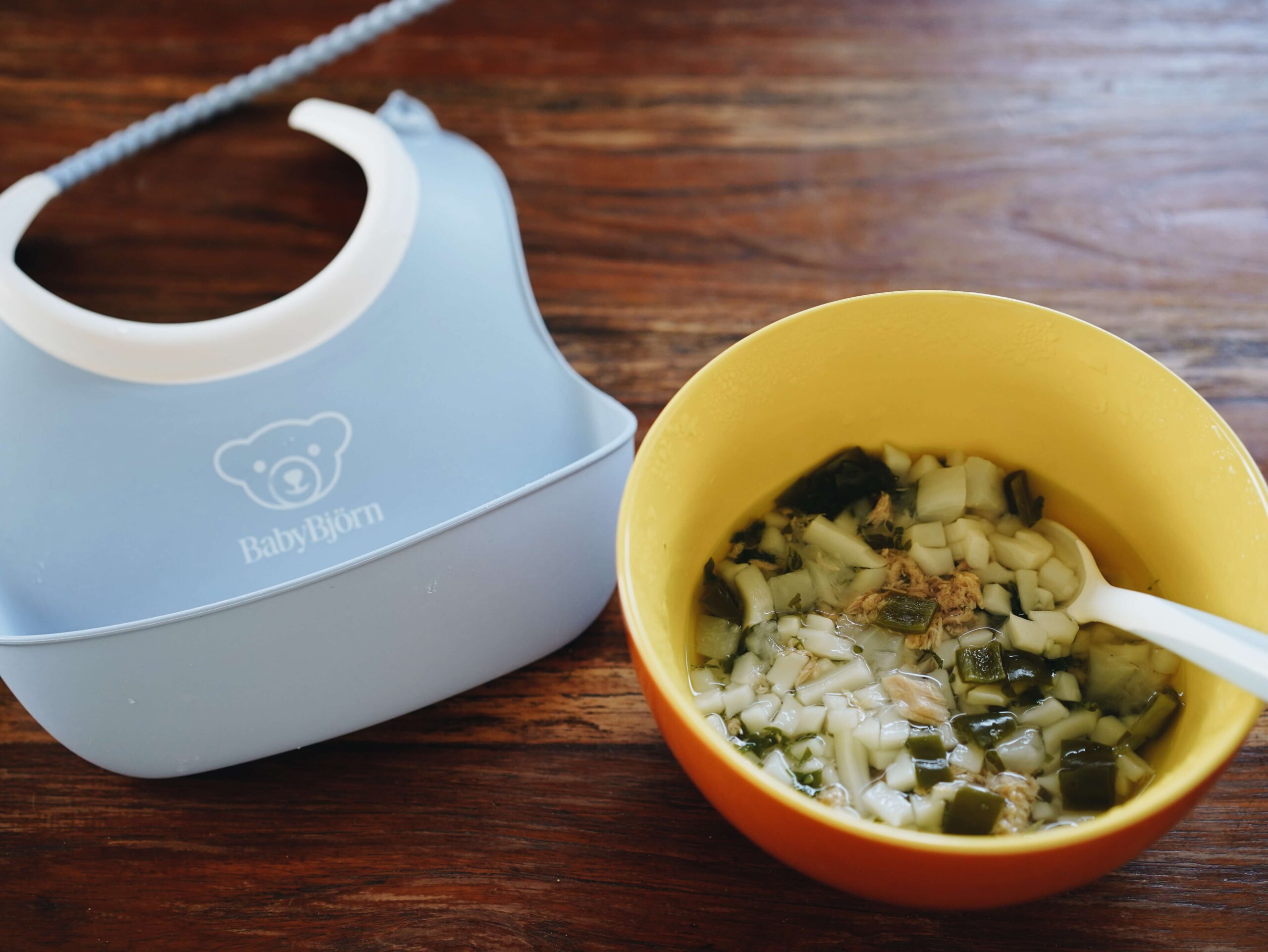 家に着いたら、水着やタオルを洗濯し、自分の髪を乾かす。それから、夫が朝に回しておいてくれた食洗機の中の食器を片付けながら、もふと私のお昼ごはんを準備する。その間、もふはベビーベッドかベビーサークルで待機。スイミングで疲れたのか、ぼーっと座っていることが多い。