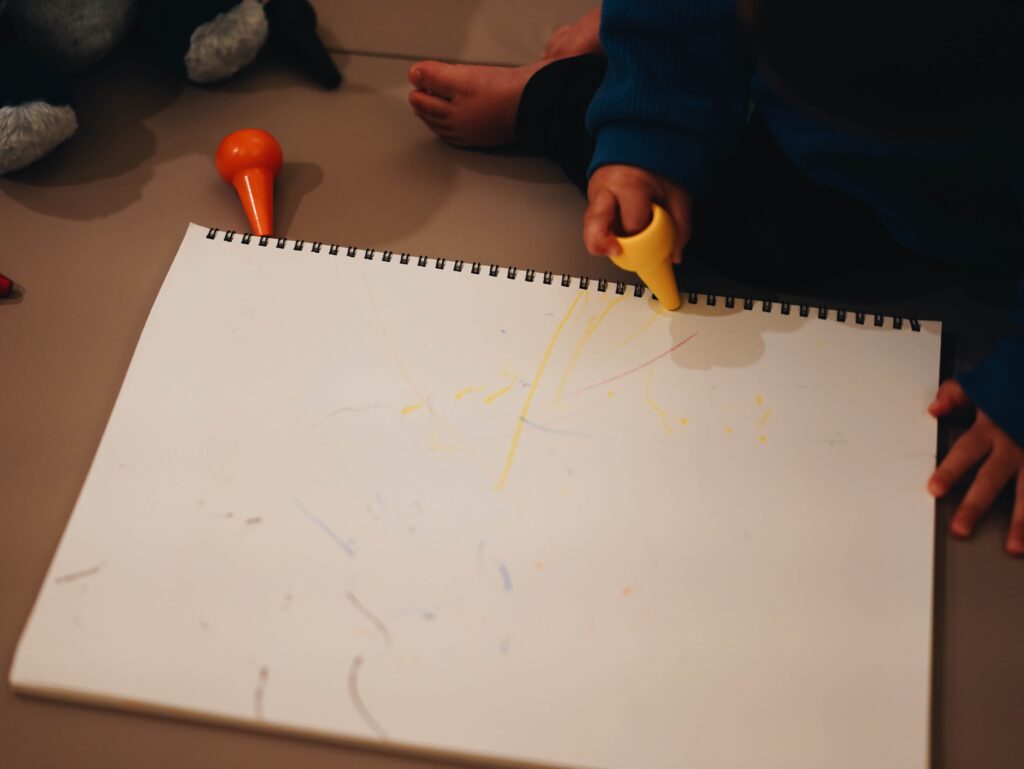 その次は、お絵描き。年始から数日おきにクレヨンと画用紙を出している。最初は点を打つことしかできなかったのが、今は線も描くようになった。変化がとても面白い。